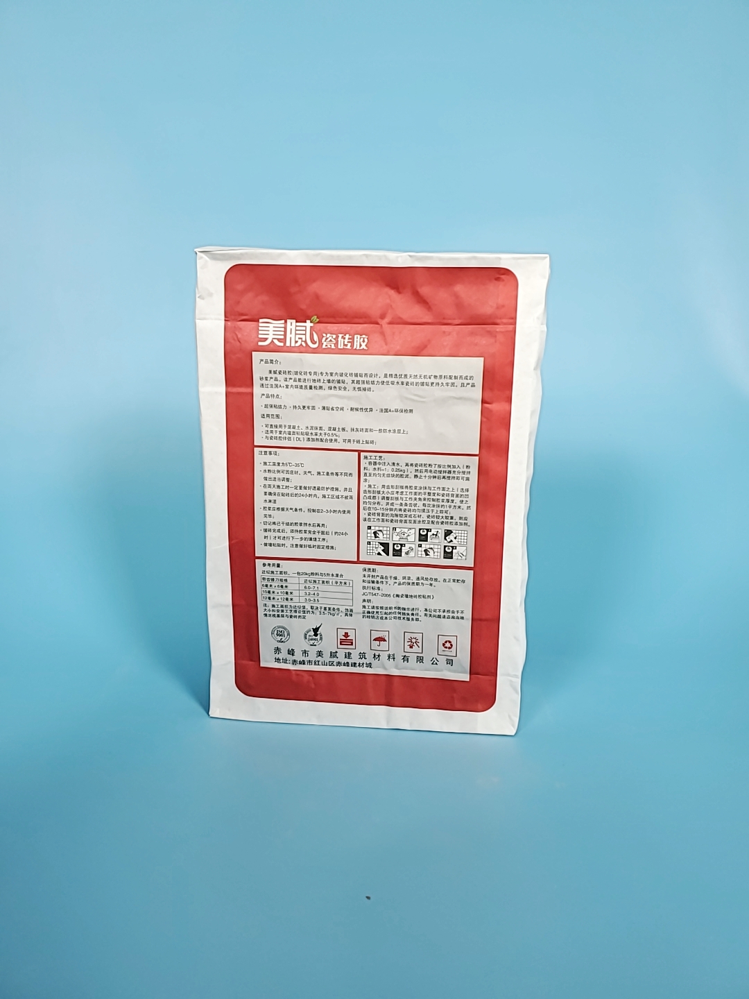 搅拌时,应先加水,建议加水量为24-26%,后加粉料,胶浆稠度以施工要求为准,搅拌均匀后,放置4-5分钟,再进行搅拌即可使用。釉面墙砖背面应干燥且无浮灰,在规定的开放时间内(一般为20分钟)完成墙砖的揉压粘贴,以利于釉面墙砖的粘贴牢固可靠。禁止无缝贴砖,一般砖缝应不小于2mm。如果釉面墙砖的尺寸较大或背面沟槽较深,建议双面涂胶。搅拌后的胶浆2小时用完,硬化化禁止使用。