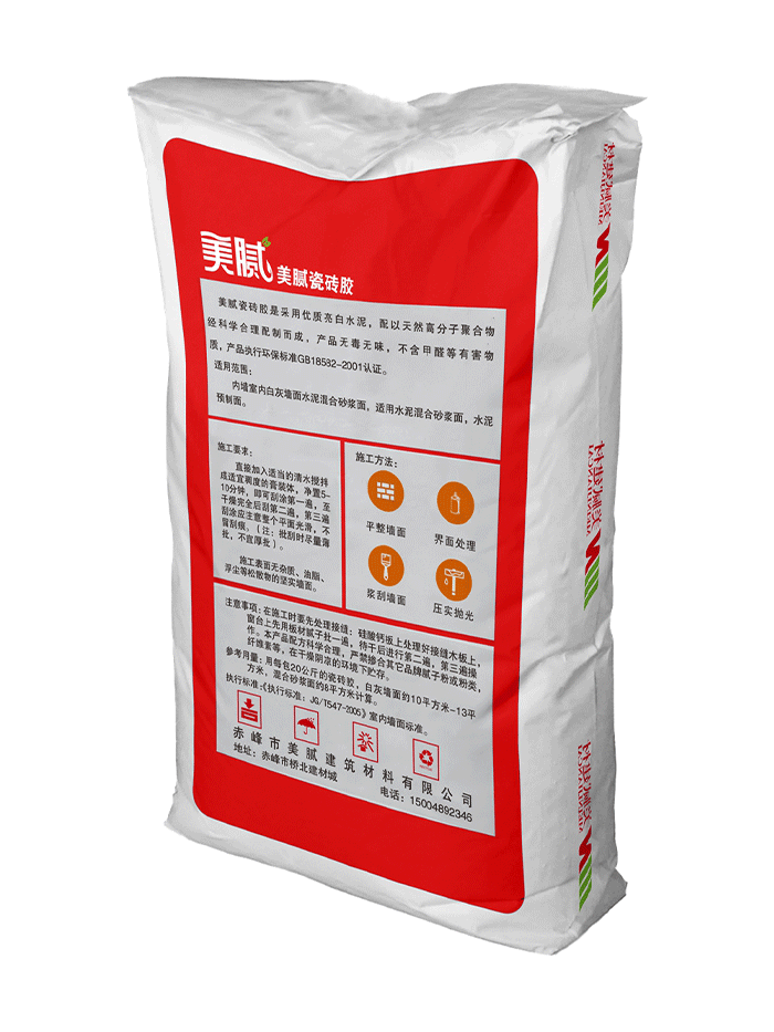 搅拌时,应先加水,建议加水量为24-26%,后加粉料,胶浆稠度以施工要求为准,搅拌均匀后,放置4-5分钟,再进行搅拌即可使用。釉面墙砖背面应干燥且无浮灰,在规定的开放时间内(一般为20分钟)完成墙砖的揉压粘贴,以利于釉面墙砖的粘贴牢固可靠。禁止无缝贴砖,一般砖缝应不小于2mm。如果釉面墙砖的尺寸较大或背面沟槽较深,建议双面涂胶。搅拌后的胶浆2小时用完,硬化化禁止使用。